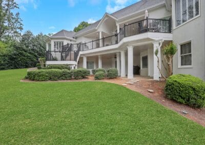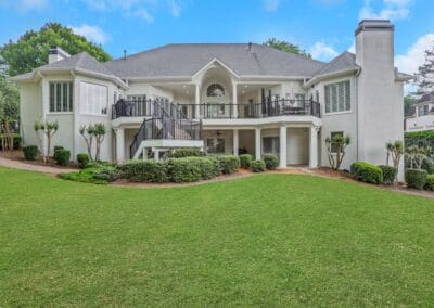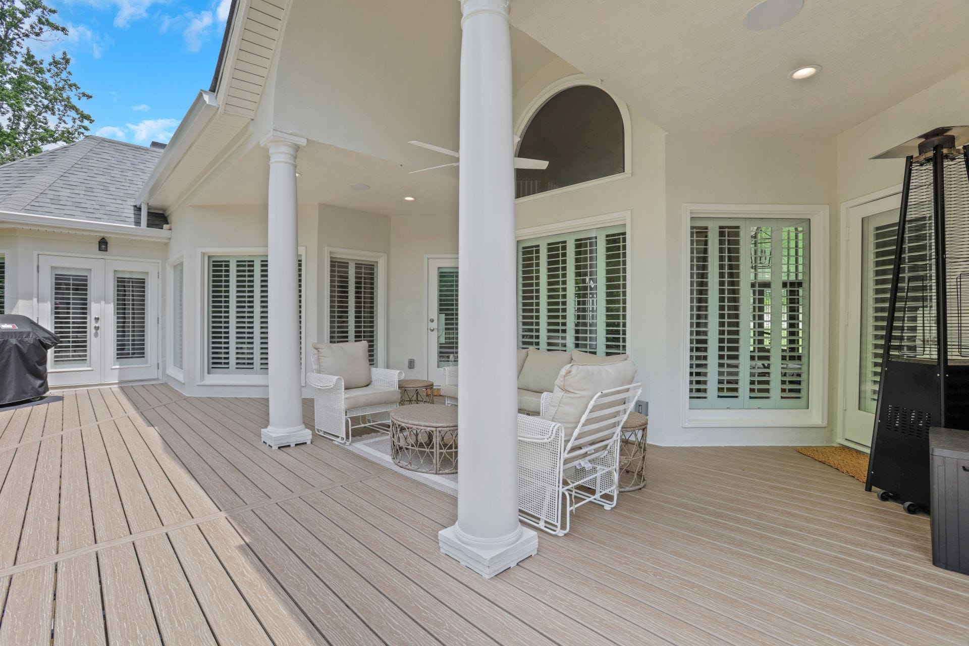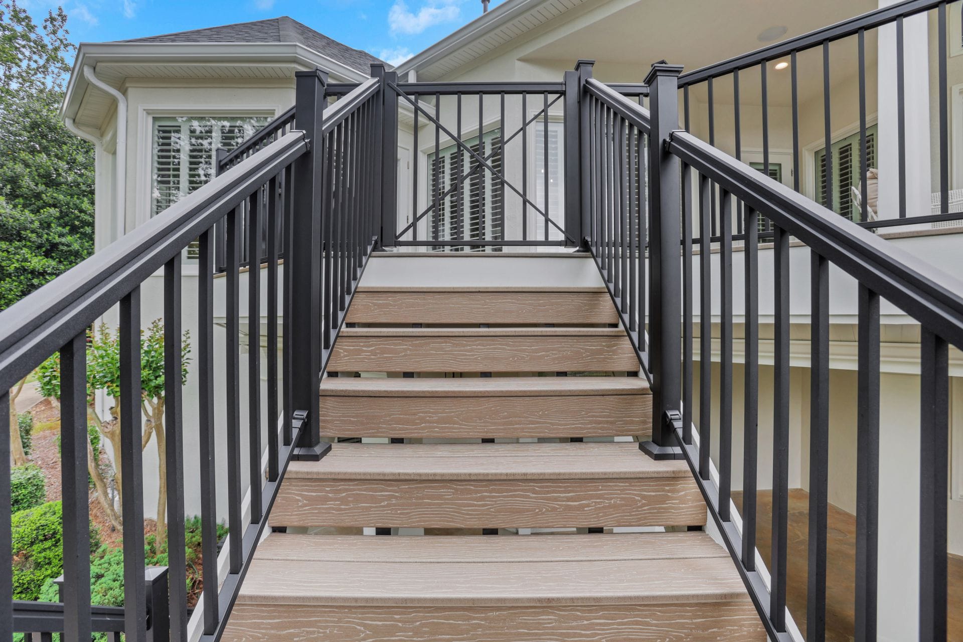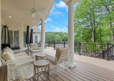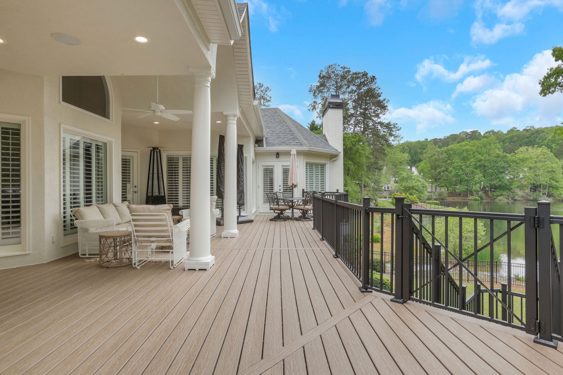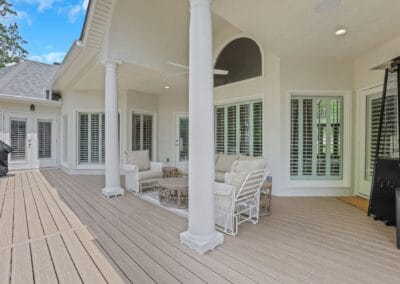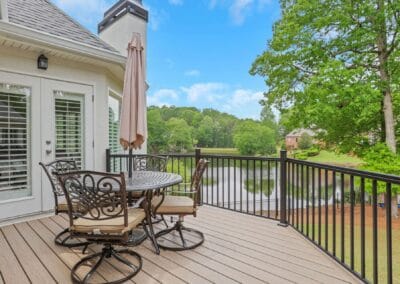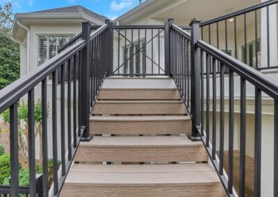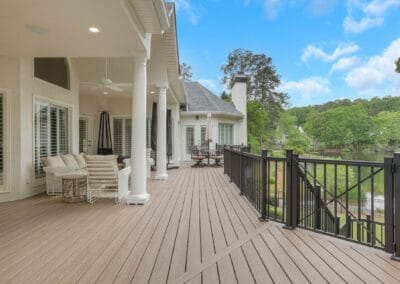There does not seem to be a straight wall on this house! The clients were adamant that the new deck would complement the homes’ angles so with that cue we designed a new low maintenance deck that looks like it belongs on the house. The roof of the house had to be temporarily supported during construction and placed back down on the finished deck. MoistureShield Vision Cool Deck was installed to help keep the deck cool in the sun. The support columns were all trimmed to finish it off. Note: The aluminum underdeck was installed outside of our scope in a separate contract by our trusted referral partner.