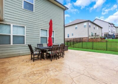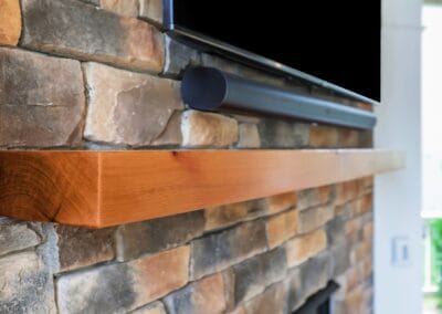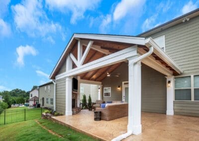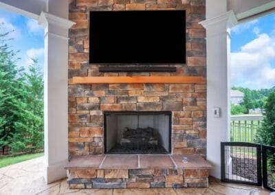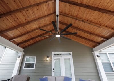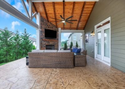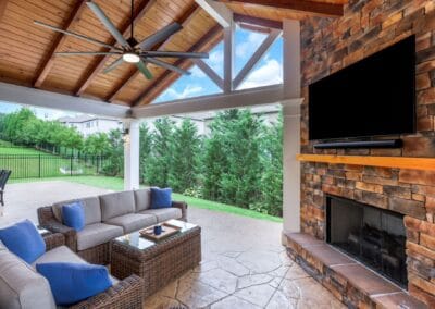 With nary a tree in sight, this client’s backyard was exposed to full sun making the backyard almost unusable. We started by removing the existing builder grade slab and installing a new, larger stamped concrete patio with monolithic footings as a base for a generously size open air gable roof patio cover with exposed rafters and a tongue and groove ceiling. A gas fireplace was installed for ambiance, privacy and a smart location to mount a TV